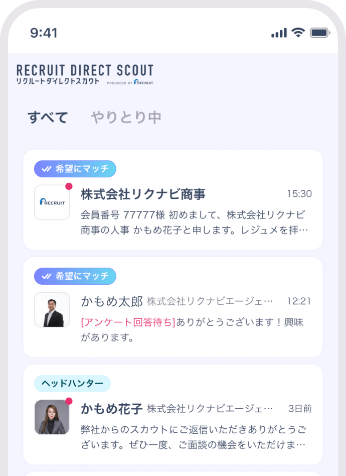 企業やエージェントとのやりとりは、チャットで。