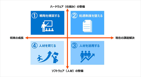 グローバルレベルで人材マネジメントの仕組みを構築するためには、4つの側面から検討しましょう。「戦略」「処遇」「活用」「育成」です。